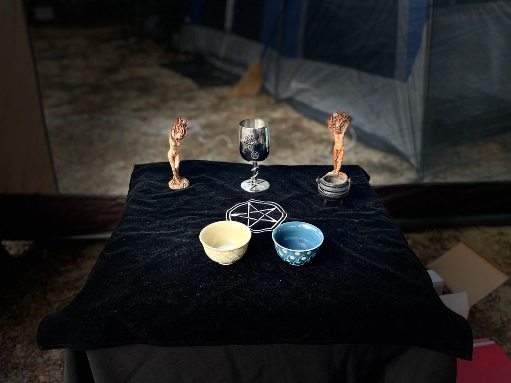 But the campsite isn’t complete until we have our altar set up. This travel altar is special and we store it with our camping gear. It isn’t used unless we’re at festival. It might be missing a few of your standard tools, but that’s only because we’re slowly adding to it. Each place we go, we try to find a new item. The god and goddess statues, for instance, were purchased from a vendor at Phoenix Festivals. This trip we found the salt and water dishes. Will we find a camping wand or athame in the future? Only time will tell!