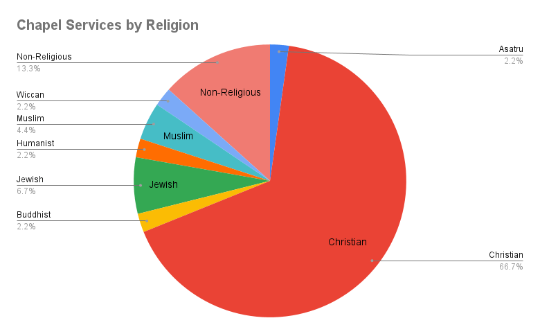 I took a list of recurring events from our local facility’s chapel schedule and tallied them up by religion.