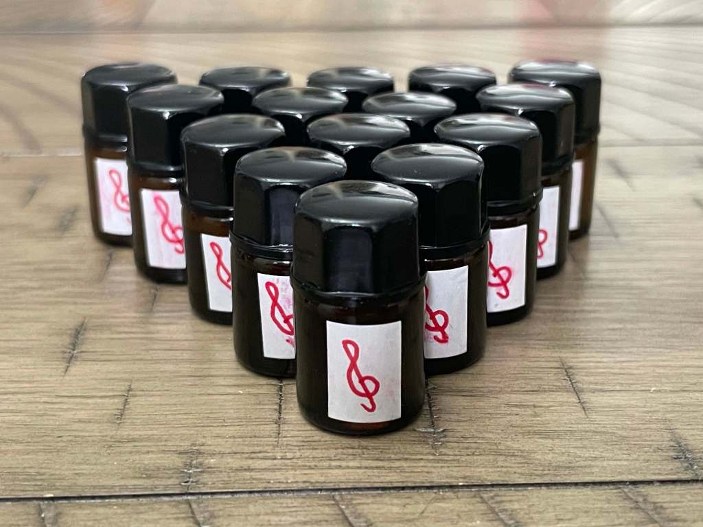 These bottles are TINY. There’s nothing for size reference in the picture, but I think they’re just shy of an inch tall. So yeah, drawing the smallest-ever treble clef and cutting a tiny label 20 times was a task. But the important part is that they’re finished.