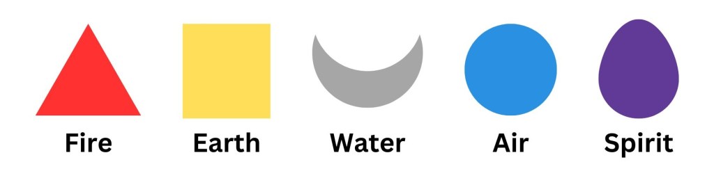 With the Tattvas, each Element has a shape and a color — a red triangle for Fire, yellow square for Earth, silver crescent for Water, blue circle for Air, and purple egg for Spirit.