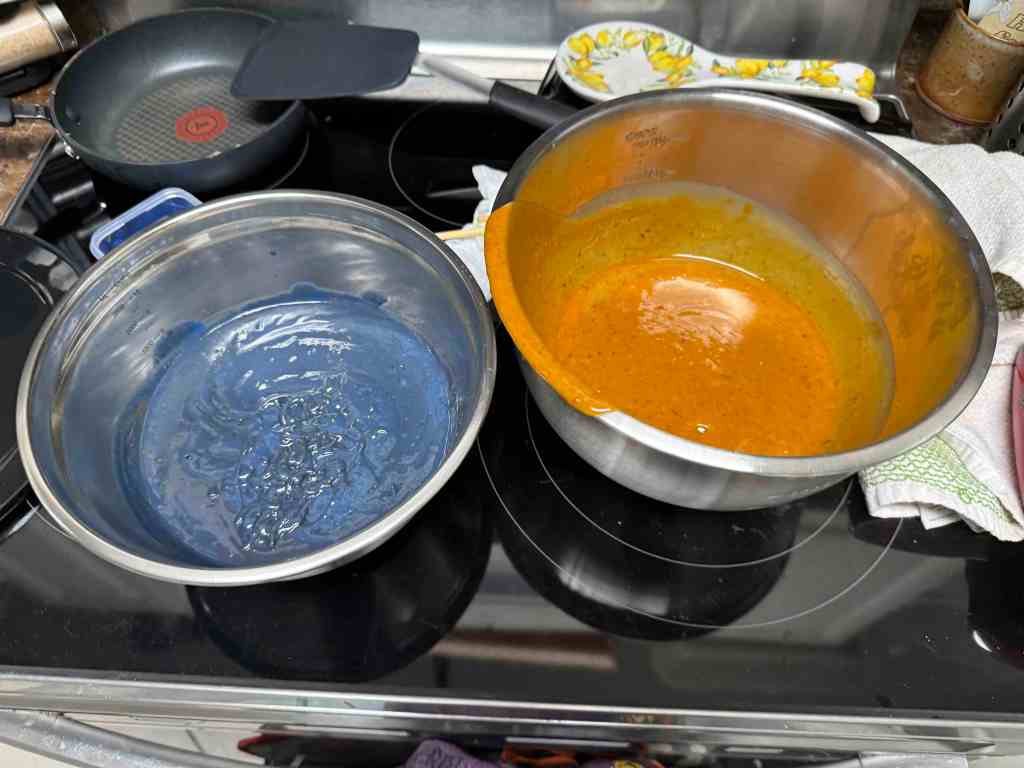 Now you’ll need to have everything else ready to go, including any essential oils or fragrances you want to add. It’s time to pour the lye water into the fats! You can blend everything together with a stick blender until it forms batter. I added the remainder of my tea leaves along with some grapefruit essential oil and blended until it was all incorporated. Since I’m making a two-color soap, I then then separated the batter into two bowls — one for the blue mica powder and one for the turmeric.