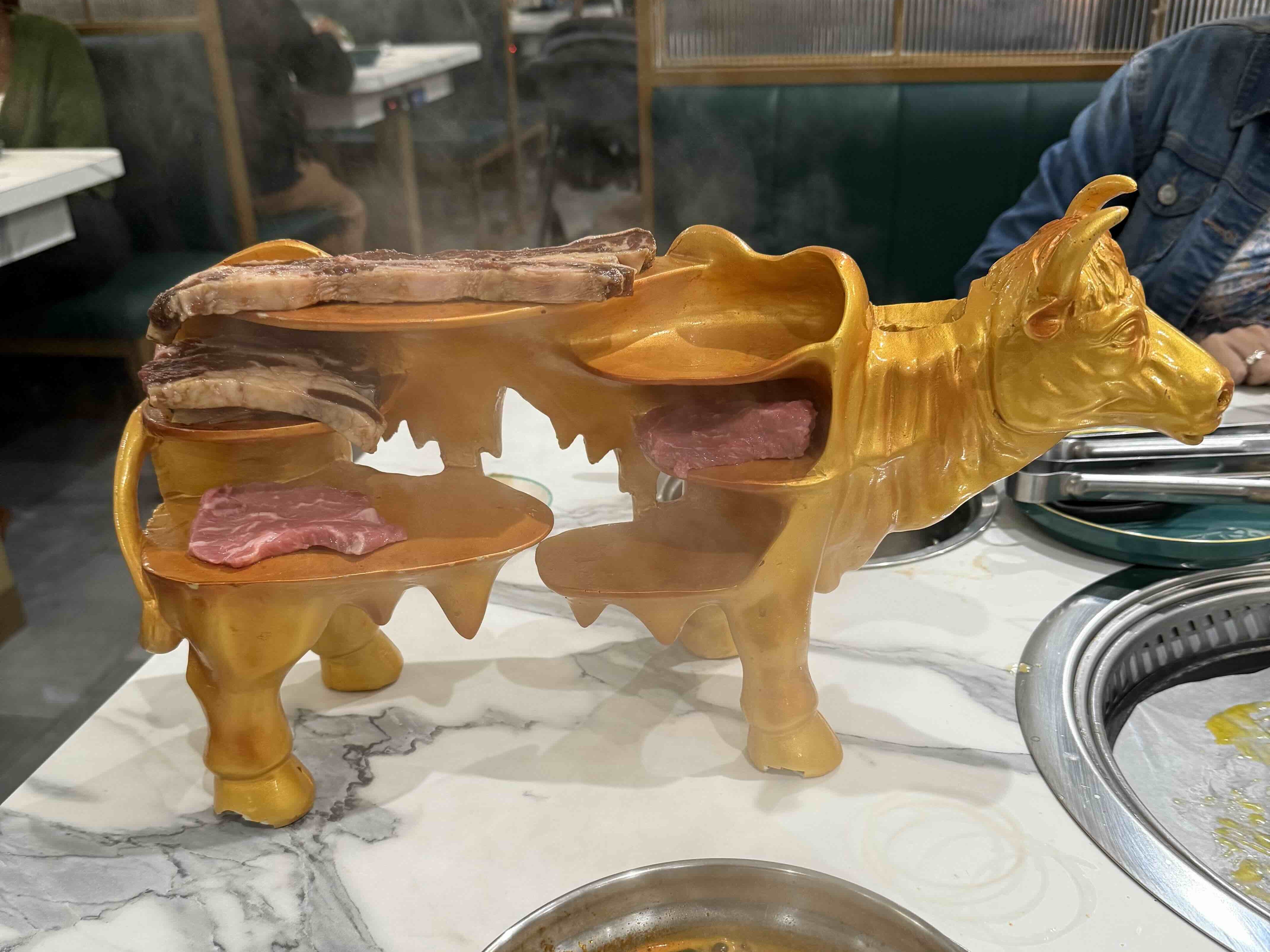 On Sunday night, Selene and I went to check out a new Hot Pot restaurant that opened up nearby. Our waitress said “I have something very special for you…” and then brought us… this giant cow sculpture filled with slabs of meat.