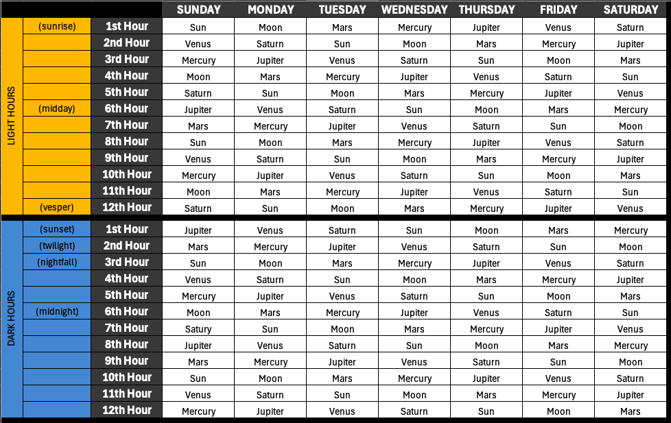 If you start in the Hour of the Sun on Sunday, then follow Chaldean order to add sequential planets a total of 24 times, you will end with the Hour of Mercury as the final period of the day. You know that’s correct because the next planet in the sequence is the Moon, which will start the light hours on Monday, the next day. Remember, the first hour of any day always begins with its governing planet. And that’s how we get the order of days.