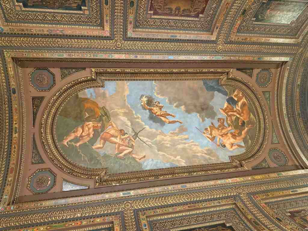 The ceiling of the upper floor is painted beautifully. Yes, lots of crazy ceilings in NY.