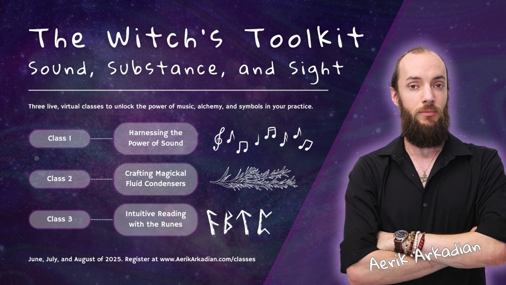 Each class is taught by Aerik Arkadian—High Priest, author, and musician—with a passion for making complicated occult topics both accessible and transformative.