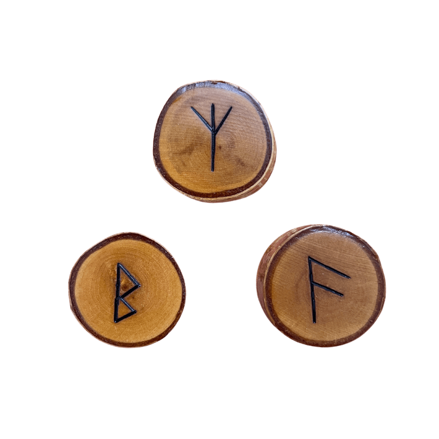 My runes are hand carved from birch. Each one has a distinct personality and message. There are 24 unique symbols with one blank to represent the unknowable (sometime’s called “Wyrd”).